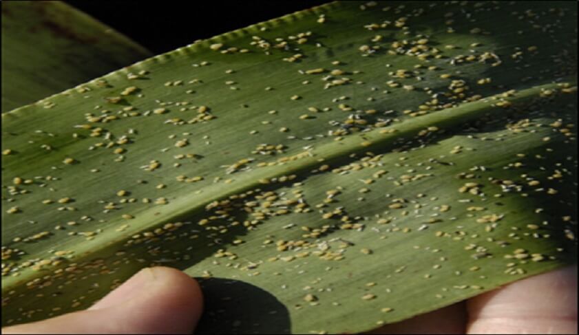 El pulgón amarillo es conocido con su nombre científico de Melanaphis sacchar y es una terrible plaga que azota al sorgo maíz entre otras siembras. El color es verde amarillento pálido a verde grisáceo y se encuentra cubierto por una fina capa de cera pulverulenta. Su cuerpo es alargado y convexo.